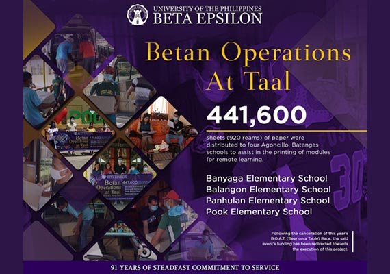 Last September 8 and 9, the UP Beta Epsilon Fraternity provided 441,600 sheets (920 reams) of paper to four elementary schools in Agoncillo, Batangas. The Banyaga Elementary School, Balangon Elementary School, Panhulan Elementary School, and Pook Elementary School utilized the documents to print supplementary modules distributed to the students during their remote learning. In January 2020, the said schools also benefited from the cleaning equipment supplied by the Beta Epsilon to help them in the rehabilitation of their schools following the devastating Taal volcanic eruption.